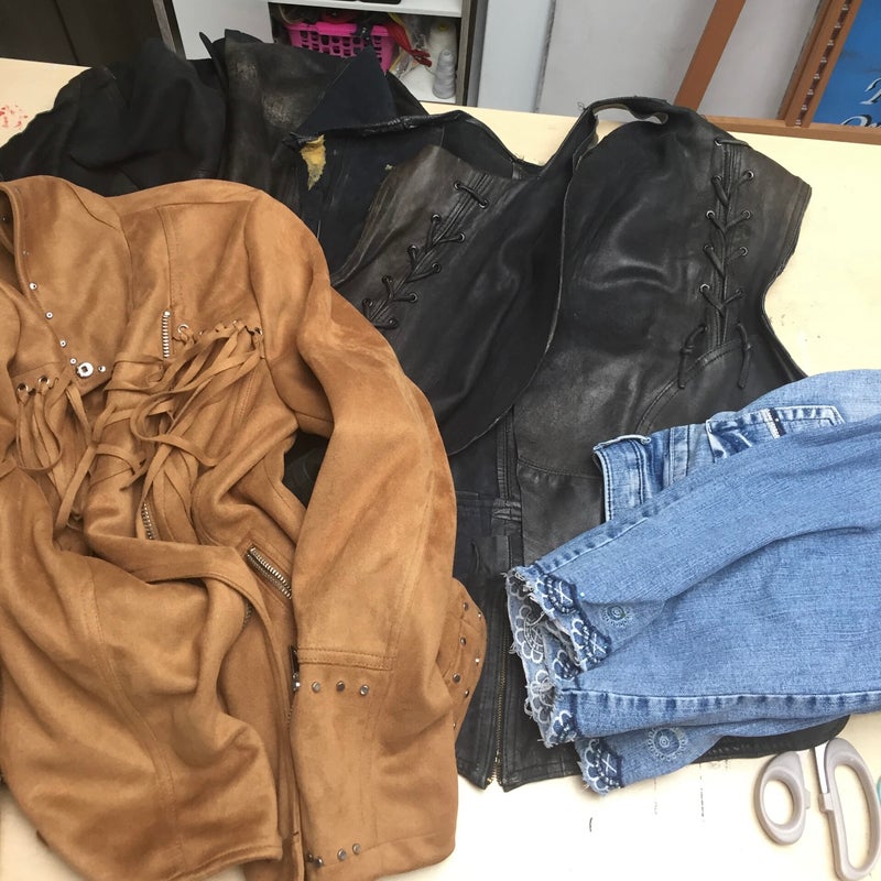 Het is gemaakt van 2 grote leren jassen, het was even passen en meten om de mooie stukken te gebruiken, hoewel het oude verweerde ook wel een stoere look gaf.