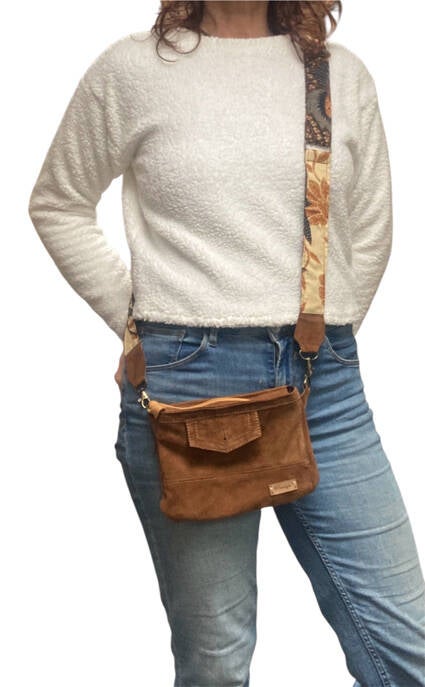 Dit handgemaakte tasje is gemaakt van zacht suède, gecombineerd met een prachtige stevige damast stof aan de voorkant. In die damast voorkant is een ruime, onopvallend verwerkte voorzak opgenomen – ideaal voor alles wat je snel bij de hand wilt hebben.