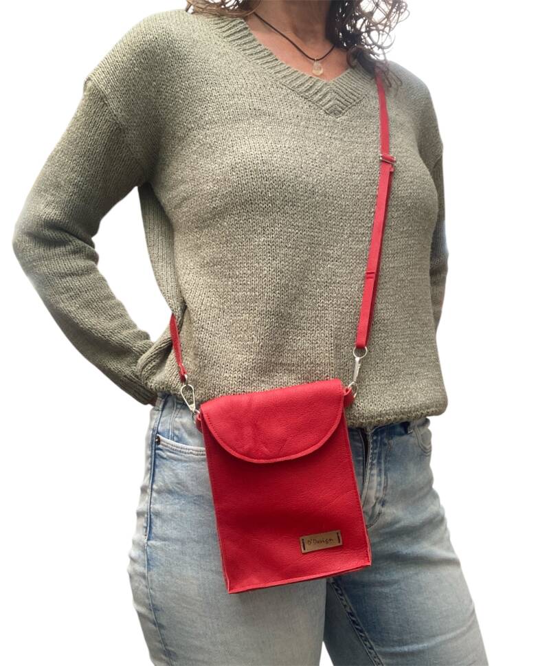 Dit is een gezellig rood tasje. Geen voering hierin, wel een klein zakje voor je pasjes. Ruim genoeg voor telefoon, sleutels en evt sigaretten. Met rode riem van hetzelfde leer die verstelbaar is voor om de schouder en om de heupen. Het tasje kan aan de lusjes van je broek gehangen worden door de musketon haken. Geen last van je schouders en toch alles bij de hand,