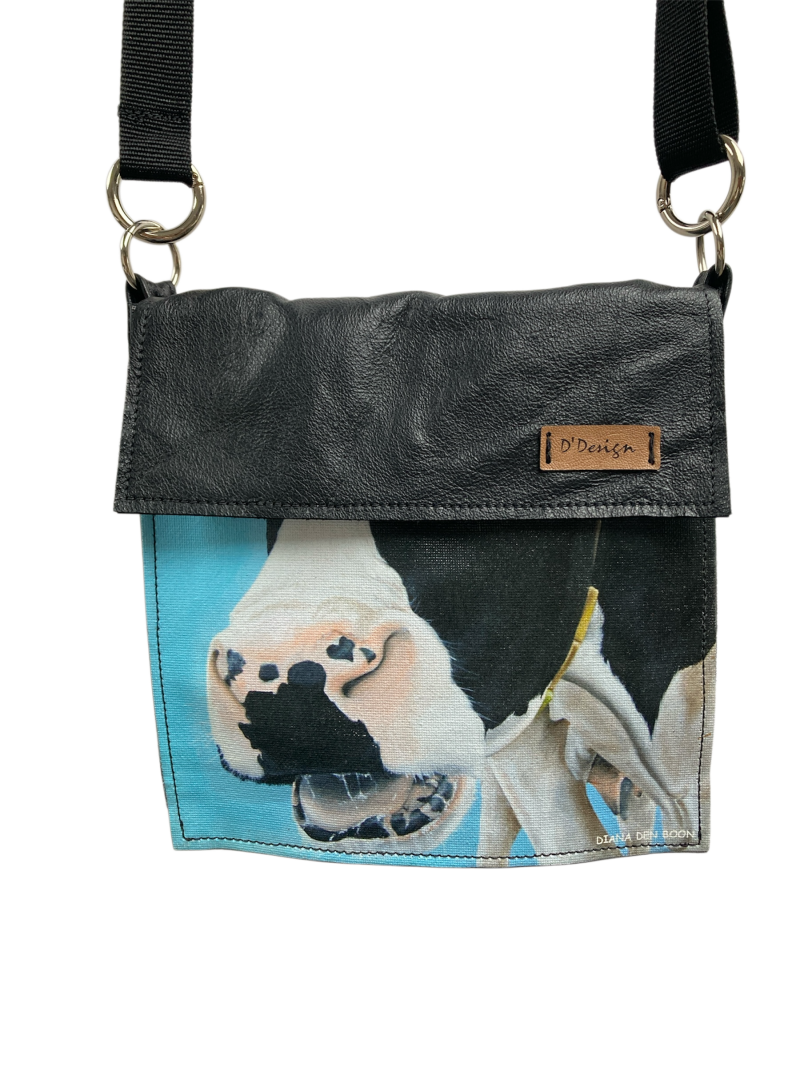 Ik heb hier een super leuke tas gemaakt van mijn oude koeien print. Dit was ooit op canvas gedrukt om te verkopen, met het idee dat je toch een schilderij van mij hebt maar dan een stukje goedkoper. Nu had ik nog wat printen staan en via via kreeg ik het idee aangedragen dat ik na ging denken over deze printen. En kijk hoe leuk dit is geworden! Dit is het laatste kleine koeien tasje.