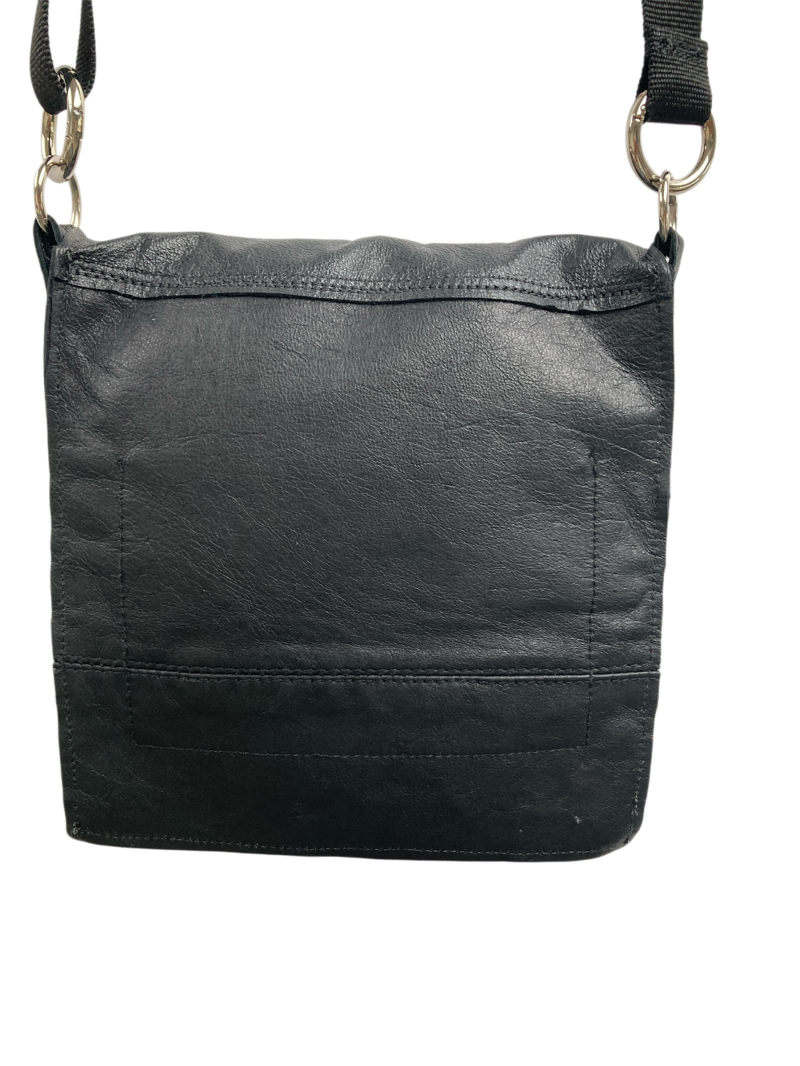 Heuptas gemaakt van soepel zwart leer. Gemaakt van een oude lange jas. Vrolijke ruit voering met een klein zakje voor je pasjes. Extra zak voorop om even je sleutels in te doen en grote zak achterop. Ruim genoeg voor telefoon, ,bril en evt sigaretten. Met zwarte stevige riem die verstelbaar is voor om de schouder en om de heupen. Of leren schouderband.