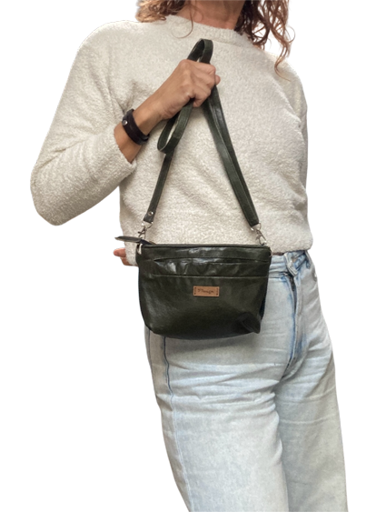 Dit tasje is ook gemaakt van de hele stugge jas. Maar dit keer een mooi heup/schoudertasje. Te dragen aan je broek met de musketonhaken of met de schouderband van hetzelfde materiaal.