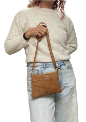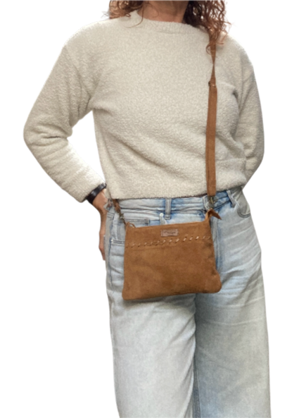 nr 298 Cognackleurig suède schoudertasje – zacht, stoer & uniek € 44.95
