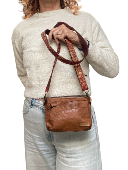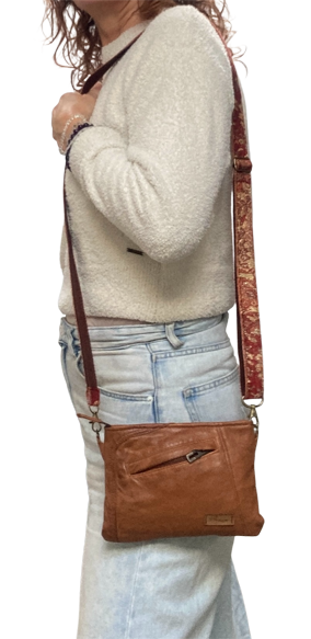 De verstelbare schouderband (150 cm) is gemaakt van een oude sjaal die perfect past bij de warme tint van het leer.