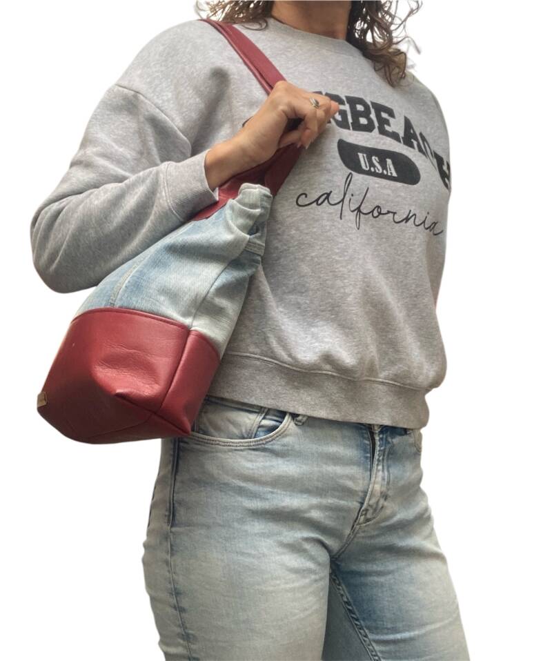 Grote vakantie Shopper met mooie felle voering, bordeaux rood Leer en denim.1 zakje aan de binnenkant.